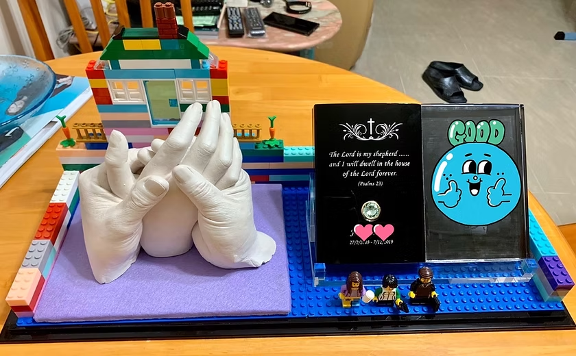 可能醫院護士見我情緒不穩定,所以取得我們同意下通知了兒童紓緩服務基金的同工,當晚十一時許兩位同工仍不辭勞苦來醫院與我們見面,了解我們的情況及紓緩我們的情緒,她們真是滿有憐憫的心。可是風風的情況在當晚之後一直反覆,而紓緩服務的護士和社工一直都有來醫院探望我們和跟我們傾談,亦提議我們可以跟風風做一些有記念價值的東西作為日後美好的回憶。有她們悉心安排下,我們一家做了一個石膏手模,手模的設計和製作是用我們一家三口的手互相緊握來做成,完成後的手模作品廷真實及充滿愛在當中。