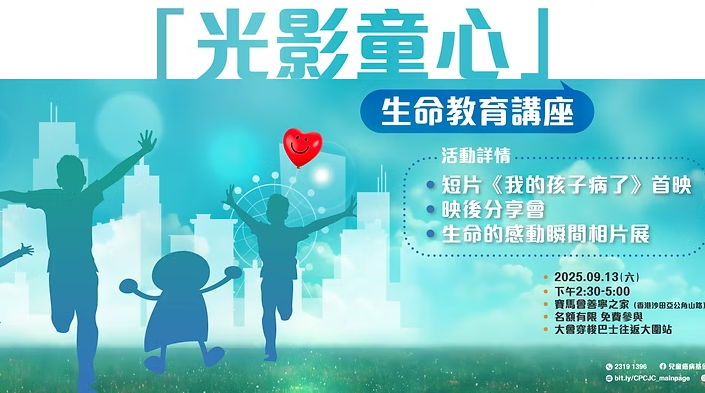 活動花絮:光影童心 2025 年 10 月 12 日活動回顧469 Views 關於生命教育講座 每個人對「生命」都有著獨特的認知與詮釋,而談論生命的過程,常被視為敏感甚至忌諱的話題。 自1999年成立以來,兒童癌病基金一直致力為患有危疾的兒童及其家庭提供優質的家居及紓緩護理服務。紓緩服務的理念是基於珍愛和尊重每一個生命,因此生命教育是紓緩服務的基石,是本會一直重視的範疇。 舉辦這個活動是期望透過服務對象的經歷讓社會大眾再一次思考在人生舞台上,即使面對生命中的各種挑戰,我們如何精彩演譯我們的人生,從而做到不枉此生。 精彩回顧 ... Read More 活動花絮:光影童心