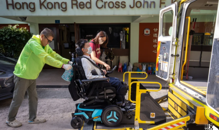 西環屈地街電車廠,一名坐在輪椅的女生,正等候着身旁的家人、工作人員與消防員義工幫忙,把她送到前面那部已安排好的觀光電車上面。